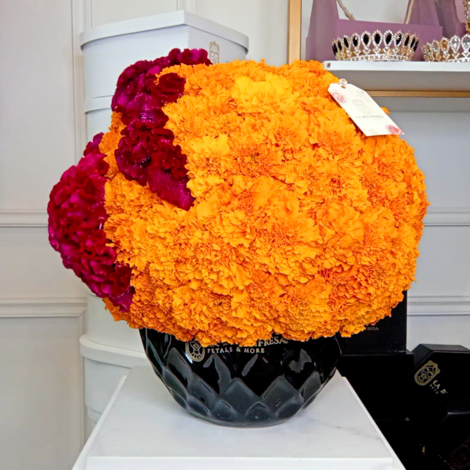 Esfera de cempasuchil y terciopelo, sobre base de ceramica negra