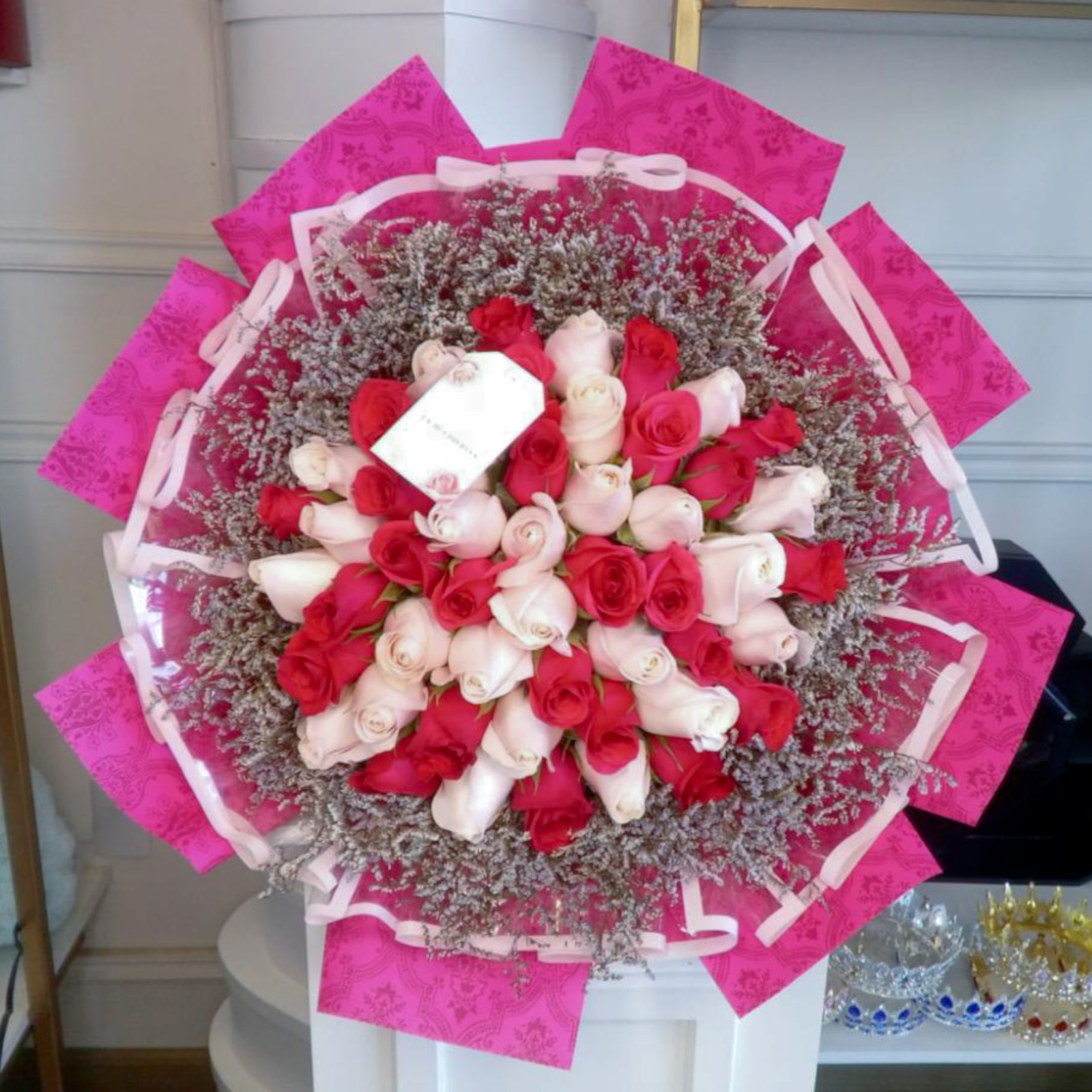 Ramo de 50 rosas rositas con fucsia premium y limonium alrededor, envuelto en papel coreano y liston