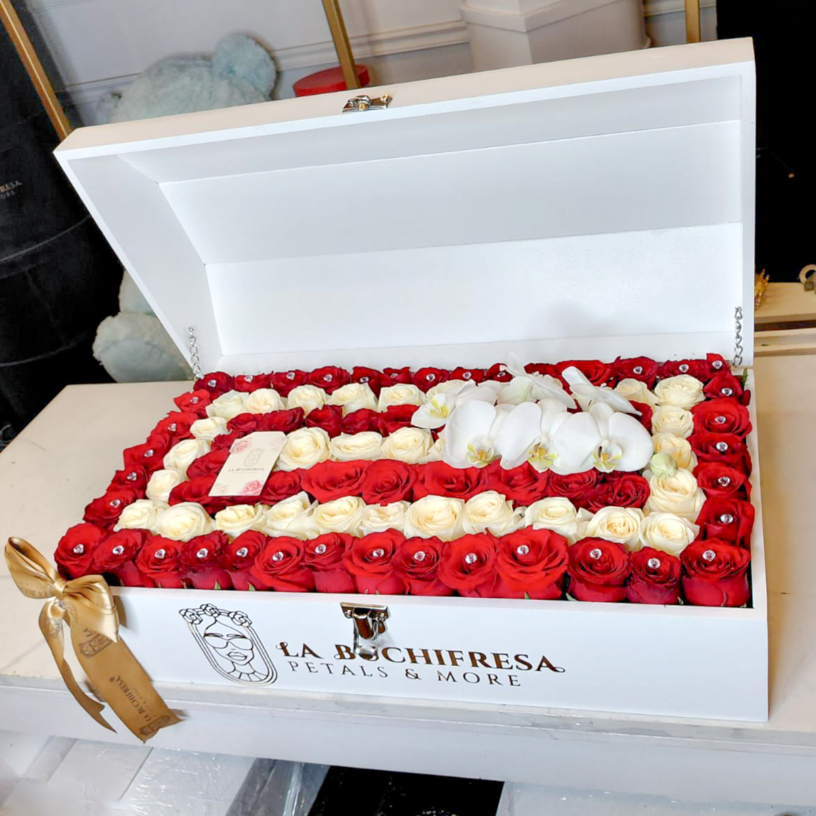 Arreglo de 100 rosas rojas y blancas con orquideas falenosis y diamantes, en cofre de madera blanco