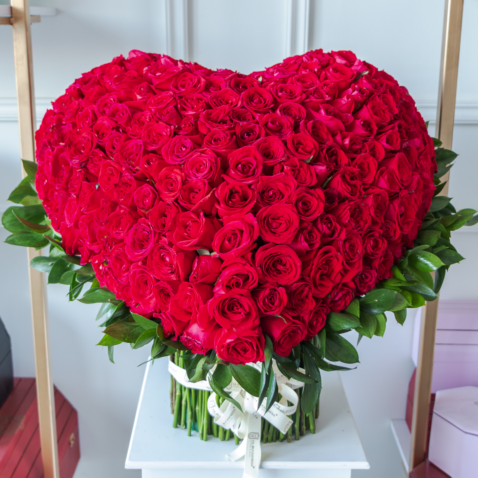 Arreglo de 300 rosas rojas premium en forma de corazon stand-up con follaje alrededor