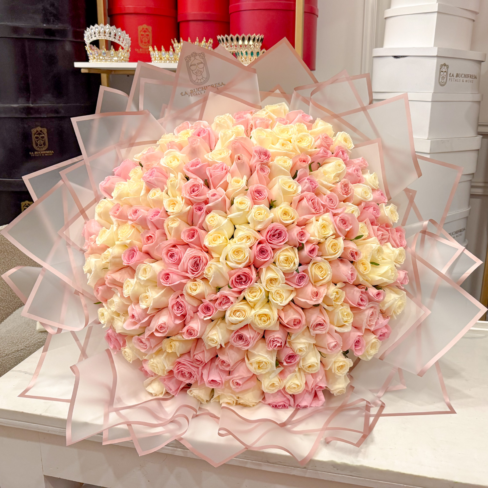 Ramo de 200 rosas rositas y blancas, envuelto en papel coreano y liston